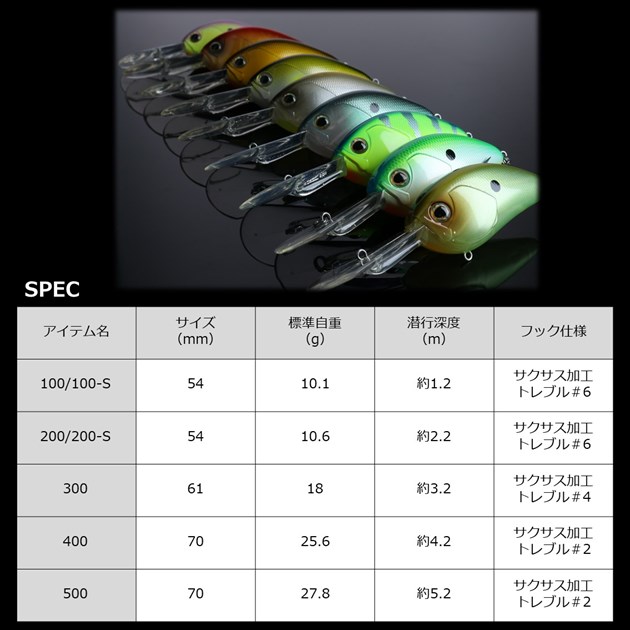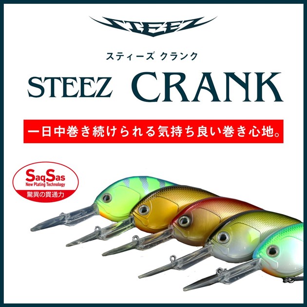 一日中巻き続けられる気持ち良い巻き心地。ストレスを感じることのない圧倒的な遠投性能と、カバーの中をストレートリトリーブで巻き切ってもスタックすることのない高い障害物回避能力。そして一日中使い続け集中力を持続できる心地よい巻き心地。「投げて巻くだけで魚が釣れる」というシンプルかつ奥深いノウハウが存分に詰まった、レンジ別に使い分けが可能なハイパフォーマンス・システムクランクベイト。それがこのスティーズクランクシリーズです。