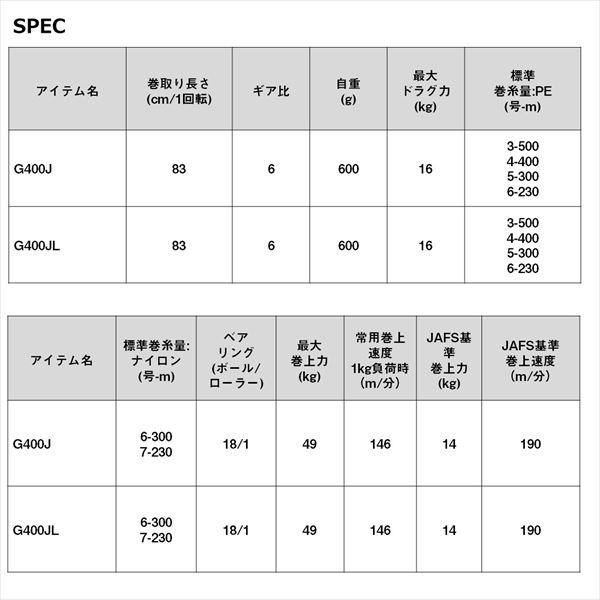 標準自重:600g 巻き取り長さ:83cm/ハンドル1回転 ギア比:6.0 標準巻糸量ナイロン:6号-300m、7号-230m 標準巻糸量PE:3号-500m、4号-400m、5号-300m、6号-230m ベアリング(ボール/ローラー):18/1 最大ドラグ力:16kg 最大巻上力:59kg 常用巻上速度1kg負荷時:146m/分 JAFS基準巻上力:14kg JAFS基準巻上速度:190m/分 ハンドルノブ仕様:アルミラウンドL