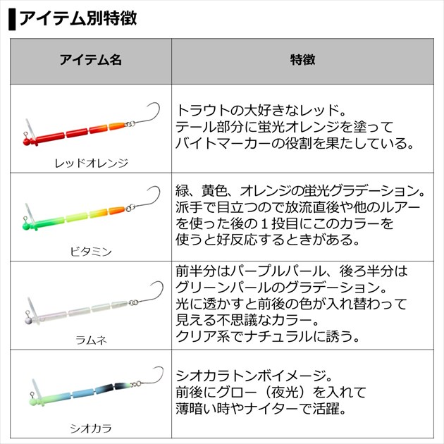 サイズ:60mm 重量:1.5g フック仕様:サクサス スピード♯6 ※実物と色が違って見える場合があります。あらかじめご了承下さい。