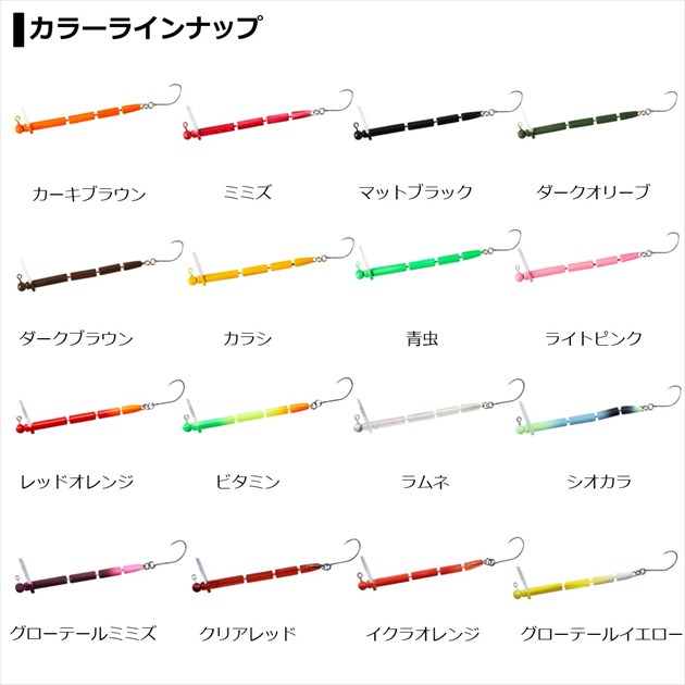 本能を刺激するミミズアクションルアー。上リップ+4連結ジョイントによる今までに見たことの無いミミズアクションプラグ。投げてゆーっくり巻くだけでプラグでありながらまるでワームのように柔らな動きを演出。投げてゆっくり巻くだけでハードルアーながら、まるでミミズのようなクネクネアクション。低速でレスポンス良く動くリップにより、その動きは専用ラインで連結されたボディへ伝わり小刻みにクネクネとアクション。使い方は、まずは足元でゆっくり引いてみて ルアーの動くスピードを確認。早すぎると回転してしまうので注意ください。あとはキャストしてルアーがアクションするスピードで巻いてください。トゥイッチングでミミズがクネッ、クネッっとなるようにアクションさせるのも効果的です。