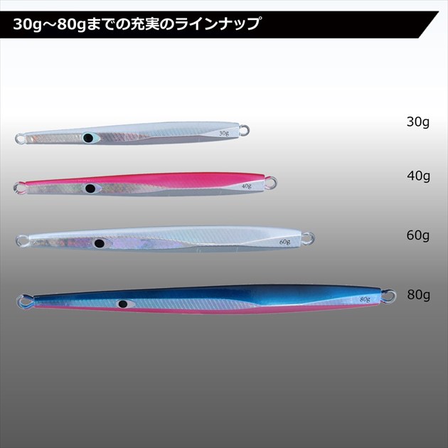 村越正海氏監修。よく飛び、早く沈み、楽々しゃくれる万能ジグがフック付きで新登場。魚皮を科学した、アデルホロを装着し、細かいディテールをブラッシュアップ。ベストセッティングのアシストフックを標準装備して、より使いやすさを極めたメタルジグ。