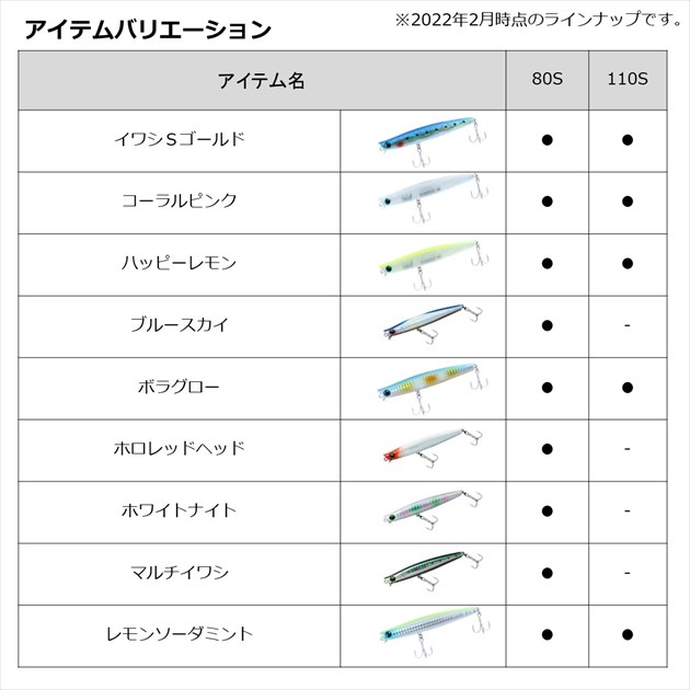 大野ゆうき監修。水面直下を広範囲で探り、緻密に攻めれる。リップ付スリムシンキングペンシル。重心移動システムと水面直下というレンジを武器に、小型ながら広範囲の魚をターゲットとすることが可能に。細身で小柄なシルエットで軽い引き心地に設定し、ピッチ速度の違いや水押しの違いでより緻密な攻め方が可能。ガルバ共通のトップレンジでアクションさせる使い方も効果的で、ただ巻きでは幅広いスピードに対応。