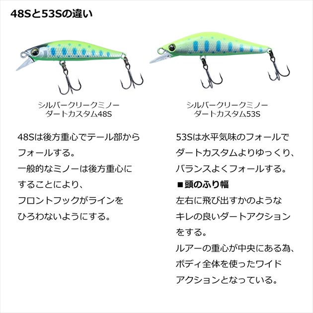 キレのあるダートアクションで追尾したトラウトを左右に揺さぶりスイッチを入れる!シルバークリークミノーダートカスタムはその名の通りダートアクションを得意とする。トゥイッチに機敏に反応し、キレのあるダートアクションでアピールしつつも、小魚のような自然なフォルムで警戒心を煽らずアプローチすることが可能。神経質なトラウトを反応させるために、シャープなダートアクションで左右に揺さぶり捕食スイッチを入れる。渓流域はもちろん、里川や中流など開けた場所でも活躍する小魚サイズの53mm。やや水平気味にフォールするように設計されたダートカスタム53Sは瀬の中を弱り漂う小魚をイメージして流すドリフトの釣りも得意とする。品質は信頼のMADE IN JAPAN