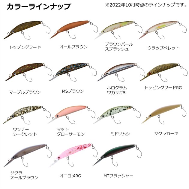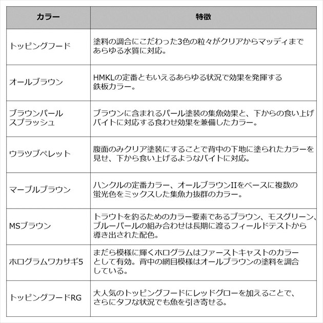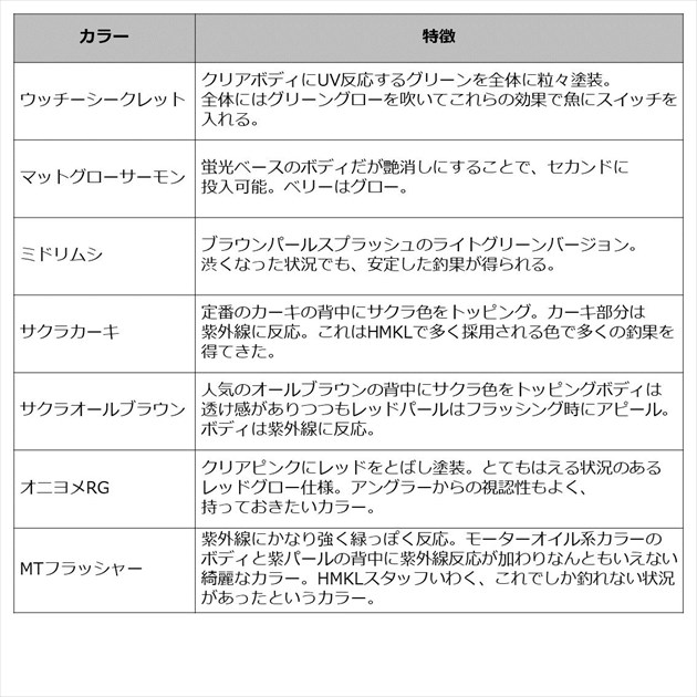 泉和摩プロデュースのエリアミノー「PRESSOダブルクラッチ」をHMKLスタッフ達がチューニング。「tuned by HMKL」の名の下、新たな個性とコンセプトを持つスペシャルモデルとして再誕した。60SHFはスーパーハイフロートモデルである。重心移動にサイレントオシレートVer.Sを使用し、滑らかで安定した重心移動を実現した。スムーズな重心移動が可能になったことにより、ウエイトを安定させていた内部のチューブを短くし、軽量化を図り、レスポンスを向上させることが出来た。また、ウエイトがより後方までスライド出来るようになったことで、従来の60F1に比べ、10%程度の飛距離アップを実現した。広域を探り、キビキビ動く60SHFの登場により、ミノーイングの幅が一気に広がる。