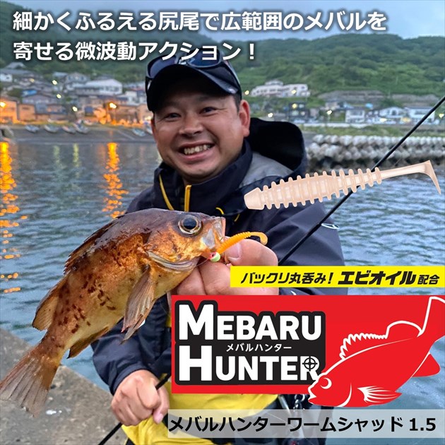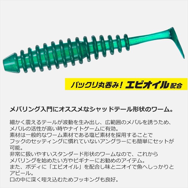メバリング入門にオススメなシャッドテール形状のワーム。細かく震えるテールが波動を生み出し、広範囲のメバルを誘うため、メバルの活性が高い時やナイトゲームに有効。ナチュラルで軟らかいアクションを生み出すメバルハンターワーム「リーチ」と使い分け、その日にあった形状の選択がお勧め。また、素材は一般的なワーム素材である塩ビ素材を採用することでフックのセッティングに慣れていないアングラーにも簡単にセットが可能。非常に扱いやすいスタンダード形状のワームですので、これからメバリングを始めたい方や初心者の方にお勧めのアイテム。また、ボディに「エビオイル」を配合し味とニオイで魚へしっかりとアピール。口の中に深く咥え込むためフッキングも良好。