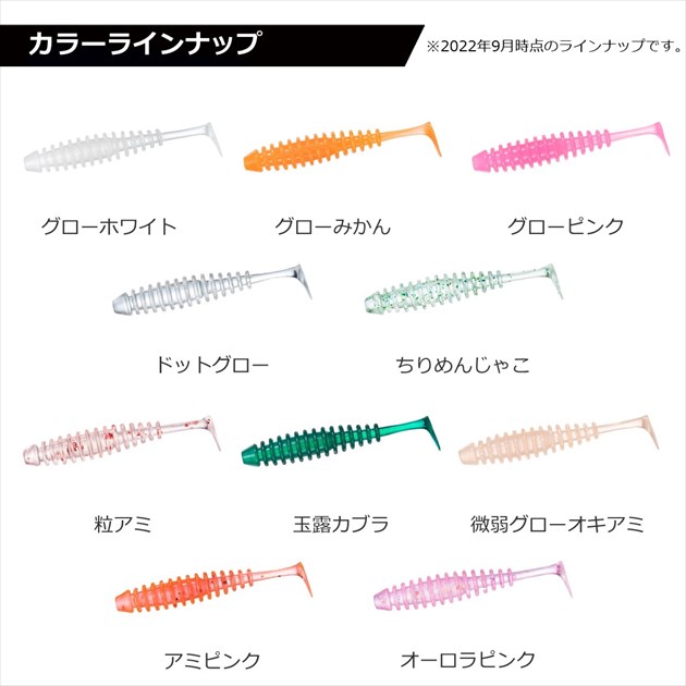 サイズ:1.5インチ 素材:塩ビ 集魚成分:エビオイル 入数:10本 ※実物と色が違って見える場合があります。あらかじめご了承下さい。