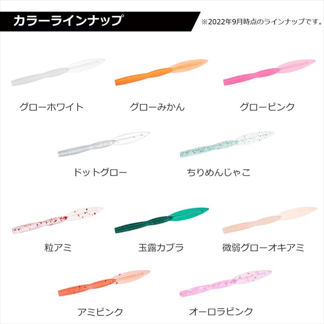 メバリング入門にオススメなストレート形状のワーム。薄く大きなテールが柔らかなアクションを生み出しナチュラルに誘うため、デイゲームやメバルがスレたと感じたときに有効。微波動を発生させるメバルハンターワーム「シャッド」と使い分け、その日にあった形状の選択がお勧め。また、素材は一般的なワーム素材である塩ビ素材を採用することでフックのセッティングに慣れていないアングラーにも簡単にセットが可能。非常に扱いやすいスタンダード形状のワームなのでこれからメバリングを始めたい方や初心者の方にお勧めのアイテム。また、ボディに「エビオイル」を配合し味とニオイで魚へしっかりとアピール。口の中に深く咥え込むためフッキングも良好。