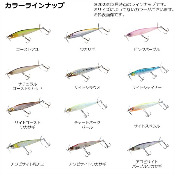 タイプ:シンキング サイズ:55mm 標準自重:3.6g フック仕様:サクサス加工トレブル#10 ※実物と色が違って見える場合があります。あらかじめご了承下さい。