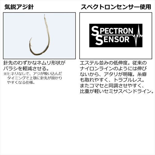 徹底的釣果主義にこだわった独自船サビキ。職人船サビキ 5つのこだわり。(1)完全手作業による製造(HAND MADE) (2)釣果に直結する針カラーの採用。擬餌の種類・特徴に合わせて独自の針カラーをセレクト。(3)スペクトロンセンサー使用。(4)擬餌が踊る枝長(ハリス)の設計。針サイズに合わせた独自の枝長(ハリス)をセレクト。(5)針サイズに合わせた擬餌の長さ・太さ(幅)設計。