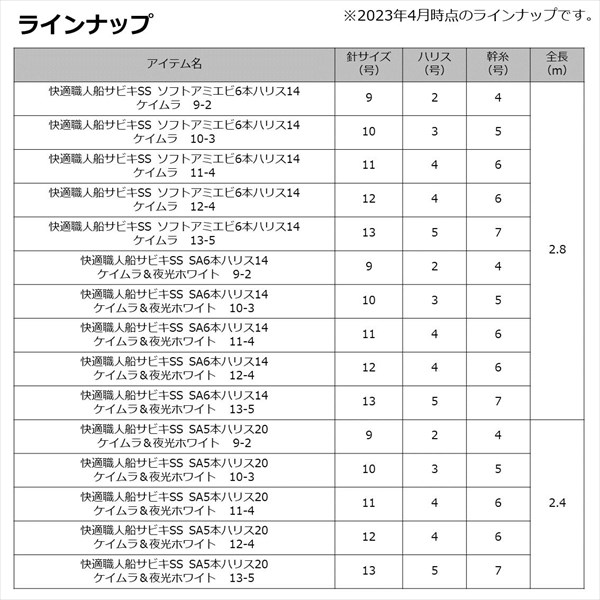 針サイズ:11号 ハリス:4号 幹糸:6号 仕掛全長:2.8m ※実物と色が違って見える場合があります。あらかじめご了承下さい。
