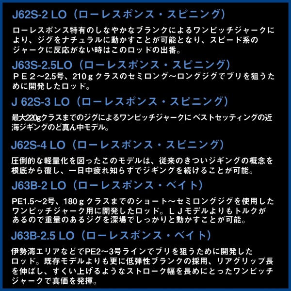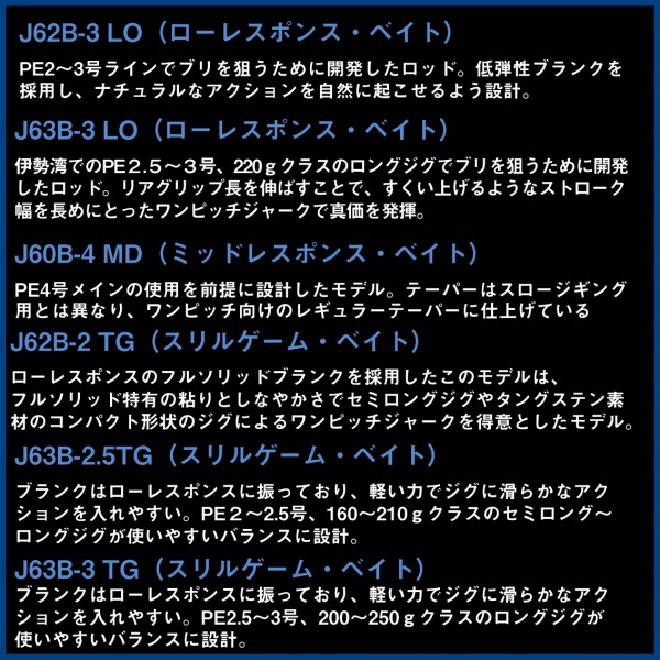 SALTIGA Rに追加アイテムが登場!異なる弾性を使い分けることで、ジャークパターン、ジグ形状、船の流し方に応じて、戦略的にレスポンス(Response=R)を使い分けることを可能にした。■J63S−2.5 LO・・・PE2〜2.5号、210gクラスのセミロング〜ロングジグでブリを狙うために開発したロッド。ローレスポンス特有の低反発ブランクながら、深場でもワンピッチジャークでしっかりとジグを動かすことが出来る力強さとしゃくりやすさを備えている。ヒット後は粘りのあるブランクがブリの引きをロッド全体で受け止めてバラシも防ぎ安心してやり取りが出来る。