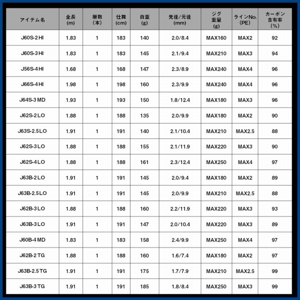 全長:1.91m 継数:1 仕舞寸法:191cm 自重:140g 先径/元径:2.1mm/10.4mm ジグ・ルアー重量:MAX210g ラインPE:MAX2.5号 カーボン含有率:88%