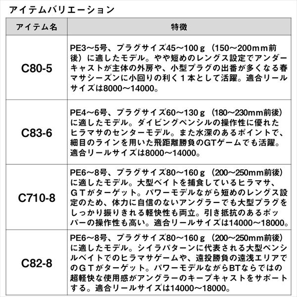 飛距離、操作性、ファイト性能 すべての動作において卓越した性能に進化したオフショアキャスティングロッド。その名が示す通り、これまでのキャスティングロッドの概念を大きく打破したシリーズにC80-5が追加。■C80-5・・・PE3〜5号、プラグサイズ45〜100g(150〜200mm前後)に適したモデル。やや短めのレングス設定でアンダーキャストが主体の外房や、小型プラグの出番が多くなる春マサシーズンに小回りの利く1本として活躍。適合リールサイズは8000〜14000。【ダイワ キャスティング情報2024】