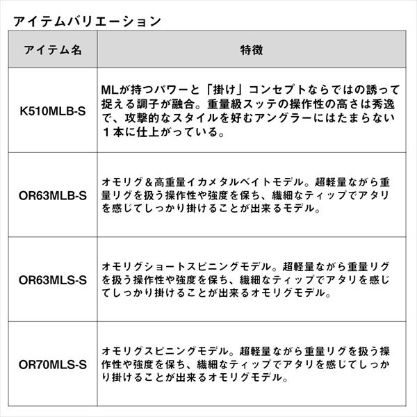 徹底的に軽さを追求したイカメタル・オモリグのハイスタンダードモデル。■K410LB-S・・・積極的に誘ってアタリを捉える「掛け」コンセプト。DAI WAイカメタルフィールドテスターの岩城透が黎明期から提唱してきた「掛け」コンセプトを「AIR」で展開。4.10ftの思い切ったショートロッドならではのダイレクト感と快適性は秀逸で、技巧派のアングラー好みの1本に仕上がっている。【ダイワ キャスティング情報2024】