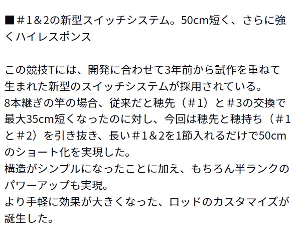 掌握する誘いと、一閃の抜き T一新。今までの概念を捨て、根本から造り変える事で新たな理想的先調子を創造。先調子ながら過剰な負荷が掛かると竿全体で曲がり込む新たな調子バランスに、特に先端部は細さとしなやかさを持たせ、T史上最高レベルの繊細さとオトリの馴染みの良さを実現。アイテムはテクニカルからHモデルまで幅広く、鮎のサイズや河川に合わせセレクト。別売替パーツも充実しており、新構造のスイッチシステムは、8本継ぎ初となる50cm短くなるだけで無く、感度とパワーも大幅に向上させる。