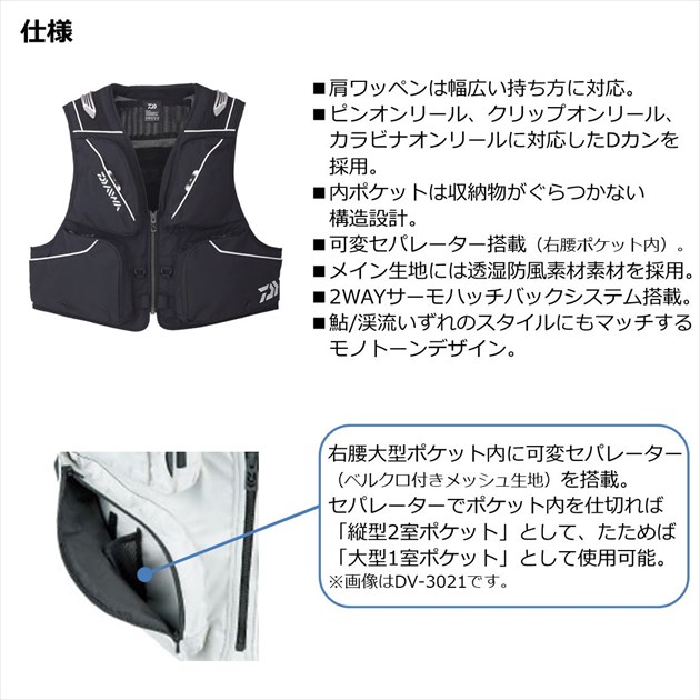 鮎、渓流などマルチに使える2WAYショートベスト。鮎、渓流いずれのスタイルにもマッチするモノトーンデザイン ■肩ワッペンは幅広い持ち方に対応。 ■ピンオンリール、クリップオンリール、カラビナオンリールに対応した新型Dカンを採用。■内ポケットは収納物がぐらつかない構造設計。■可変セパレーター搭載(右腰ポケット内)■メイン生地には透湿防風素材素材を採用 ■2WAYサーモハッチバックシステム搭載