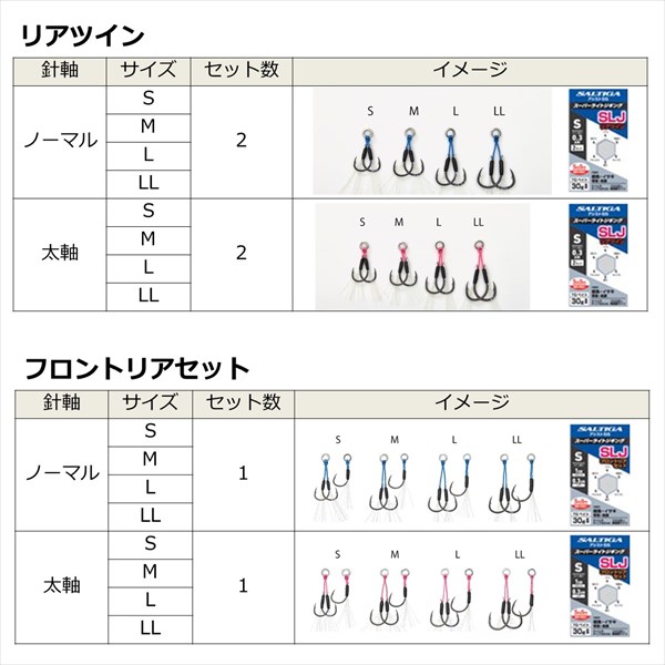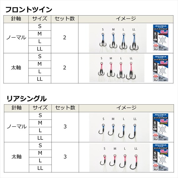 SLJに最適な様々な対象魚にマッチしたアシストフック。ソルティガアシストSSシリーズにSLJタイプが追加。様々な対象魚を狙うSLJ。狙う魚や場所によってフックサイズや本数を変えることもあるため、「フロントツイン」「リアシングル」「リアツイン」など合計32アイテムで、どんなシチュエーションにも対応できるラインアップを用意。