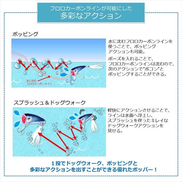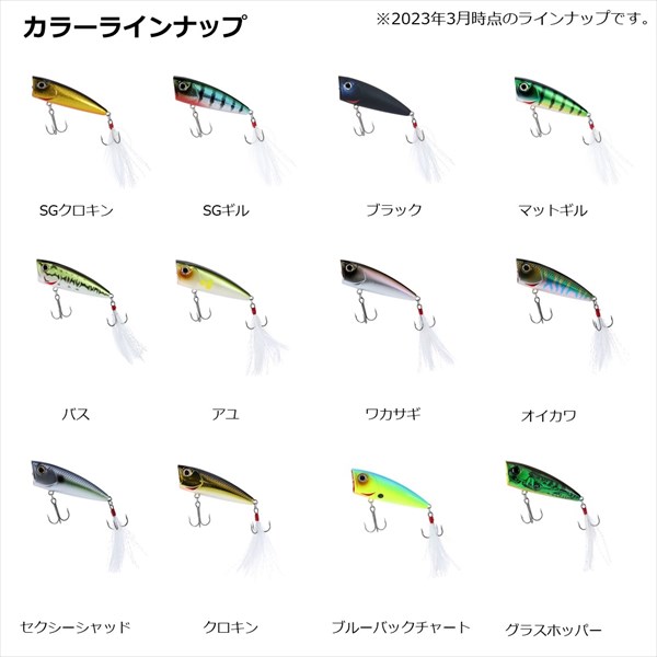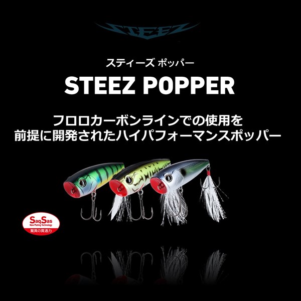 フロロカーボンラインでの使用を前提に開発されたハイパフォーマンスポッパー。多くのトップウォータープラグには、比重が軽く水に浮くナイロンラインやPEラインを使うことが推奨されており、きちんとアクションをつけるにはそれがほぼ必須の条件になっています。しかしながら持ち歩けるタックル数に限りがあるオカッパリや、極力ロッドの本数を減らしたいスモールボートでの釣行時には、トップウォーター用というだけでもうワンタックルを追加で準備することが困難な場合もあります。スティーズポッパーはその浮力やバランス、アクションを調整し、現在のバスフィッシングにおいて主流といえる「フロロカーボンライン」での使用を前提として開発された、数少ないバーサタイル系タックル対応型のポッパーといえます。最小サイズの50F(全長50mm)は、野池や小規模河川などのスモールベイトや虫パターンに対応。