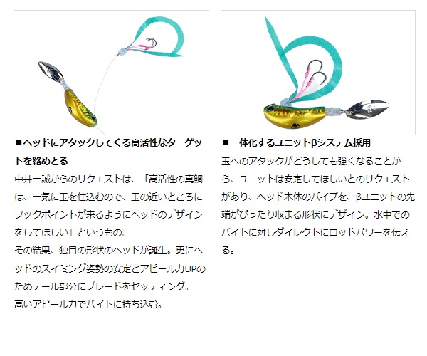 中井一誠が提唱する新メソッド「玉噛みコンセプト」を具現化したタングステンタイラバヘッド。中井一誠氏が提唱する、「真鯛の活性を上げて効率的に釣る」タイラバ新メソッド「玉噛みコンセプト」。ヘッドにダイレクトに当てってくる真鯛に対し、フッキング性能を向上させるために、ヘッドに近い位置にフックポジションがくるように新たにデザイン。高比重タングステン素材による確実なタッチアンドゴーとブレードによるアピールで強烈にターゲットにアピール。