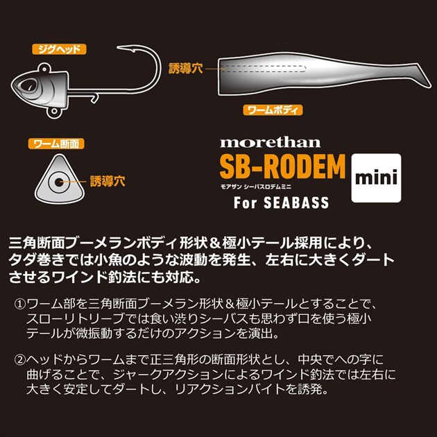 シーバス専用リアルシャッドワームセット「SB-RODEM」に、食い渋り、マイクロベイト対応のminiサイズが登場!三角断面ブーメランボディ形状&極小テール採用により、タダ巻きでは小魚のような波動を発生、左右に大きくダートさせるワインド釣法にも対応。