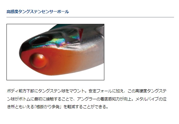 シーバスのデイゲームには欠かせないジャンルとなった鉄板系。飛ぶ、沈む、泳ぐ、強アピールはもはや当たり前。それに「快適な使用感」を加えた鉄板系の真打がリアルスティール。投げるたびにフックとラインが絡まるようではアングラーのテンションもガタ落ち。一投入魂のリアルスティールは、ほとんどトラブルレスなので集中できる。また、安定した前傾フォール姿勢を保つリアルスティールは、ポイントへとほぼストレートに落ちていく。これによってアングラーのイメージどおりのトレースコースを正確になぞれるのだ。さらにボディ前方下部にマウントされた高硬度タングステンボールが最初にボトムにコンタクトすることで、アングラーの着底感知力が向上。鉄板系の泣き所である根掛かり多発を軽減することができる。
