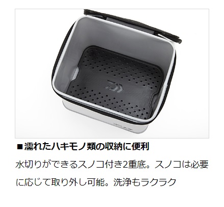 シューズ、ブーツ、ウェーダーの「運搬・保管に最適」。収納物が確認しやすい「透明フタ」。ハキモノ類から染み出た水を切り易い「スノコ付き」開口部には型くずれしにくいフレーム入り。汚水がシューズ類内に入りにくく、車載しやすい縦型形状。持ち運びに便利なショルダーベルト。丸洗いでき、お手入れ簡単なEVA素材。