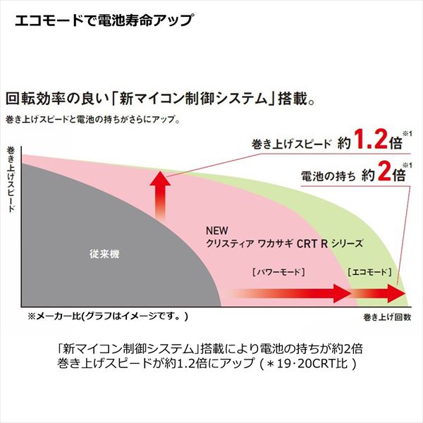 スピード・電池の持ち大幅アップ!「棚停止」機能付き定番モデル。基本性能のバージョンアップ。より回転効率の良い「新マイコン制御システム」搭載により電池の持ちが約2倍/巻き上げスピードが約1.2倍にアップ(*19・20CRT比)。パワーモード/エコモード選択。エコモードは「新マイコン制御システム」搭載により電池が長持ち。パワーモードはモーターへ常に電流を流しブレーキを掛けることで重いオモリや長い穂先など、高負荷時によりパワフルな巻き上げが可能。