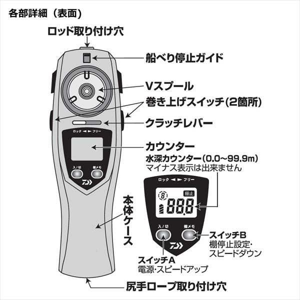 自重:約97g 標準巻糸量:0.3号-60m/0.4号-30m 電源:単4形アルカリ電池2本(別売) 注)充電式(ニッケル水素)電池を使用した場合、電圧が低いため十分な性能を発揮できません。