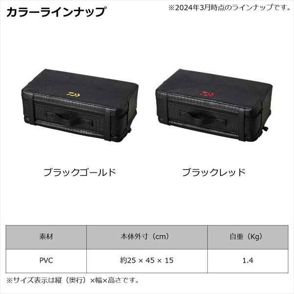 疲れにくい硬めの芯材を採用したダイワへらクッションの最高峰!長時間座っていても疲れにくい硬めの芯材を採用。クロコダイル調のエンボス加工を施した、汚れ、水に強い防水生地。耐久性に優れたPVC素材を使用。取り回しやすいハンドル付き。ダイワ へらバッグ(G)の上部、内側に収納可能。ダイワ へらバッグ(G)、ダイワへらリュック(G)に取り付けできるフックループ付き。