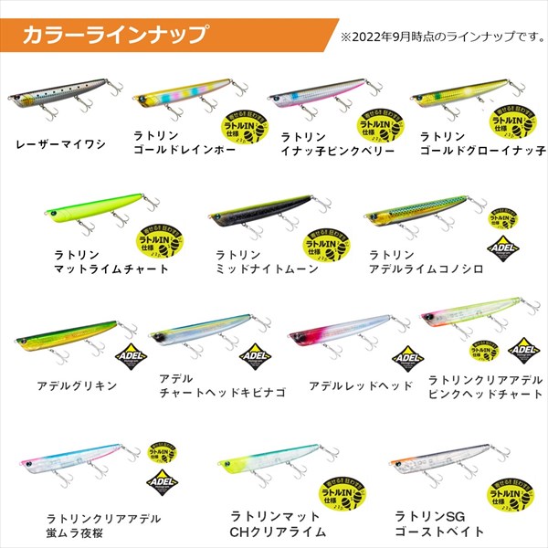 サイズ:140mm 標準自重:30.5g レンジ:水面〜水面直下 飛距離:最大57m、平均55.4m(ノーマルタイプ) 最適アクション:STOPI&GO(ポーズ2秒。荒天時は5秒) フック仕様:♯3トレブル、リング♯3