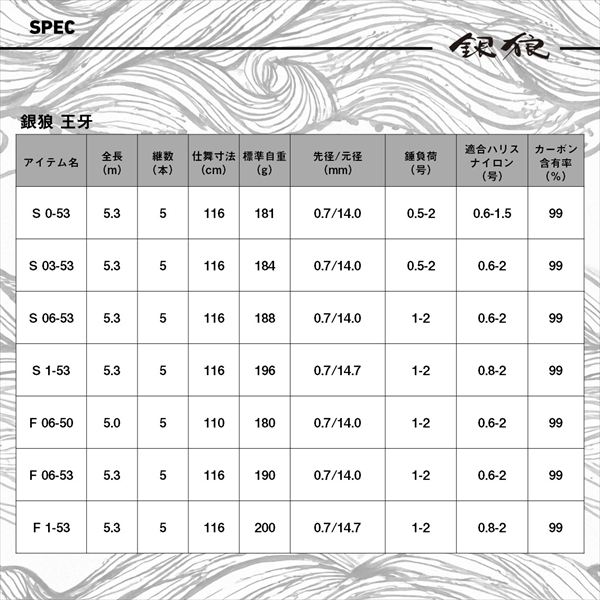 超細身×高弾性カーボンが創造する次世代チヌフカセ竿。超細身肉厚ブランクと高弾性カーボンが融合した「パワースリムブランク」を纏い、劇的な進化を遂げた新生「銀狼王牙」。エリア・フィールドに合わせて選べる2つの調子をラインナップ。胴調子「S」は元竿まで美しく曲がり込み、チヌを手玉に取るようにあしらいながら1匹1匹とのやり取りを楽しむことが可能。先調子「F」はフッキングレスポンスに優れ、やり取り時の魚のコントロール性も高く、磯場・深場の攻略に適したバランスを備える。■S1-53・・・曲げ込むほどに生み出される強力なリフト力で、魚を一気に浮かせることができるパワーモデル。元竿を深く曲げ込むほどに溢れ出るパワーは、これまでのチヌ竿とは一線を画す。急流や深場での釣りも難なくこなし、大型チヌやマダイを一気に浮かせ、素早く勝負を決めるパワーファイトに最適なアイテム。