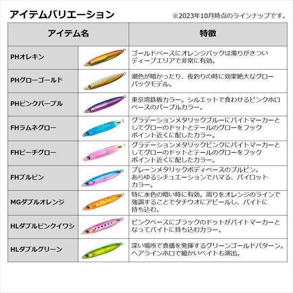タチウオの捕食行動を研究し、行き着いたセンターバランス設計。鋭く研ぎ澄まされたヘッドにより引き抵抗大幅軽減。アングラーの疲労を抑えながら、刻一刻と変化する食わせの間に柔軟に対応できる。ジャーク時の素直なフォールアクションでジグが横向きになり違和感無くタチウオが口を使う。タチウオの鋭い歯にもはがれにくいHD塗装を採用。フックは別売りの「鏡牙フックSSバラシレストレブル&クワトロ」がベストマッチ。