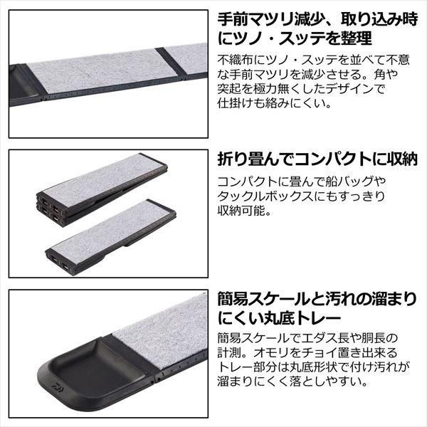 手前マツリ防止で手返しアップ!!コンパクトに折り畳めるイカ仕掛け用マット。スッテやプラヅノをマットに並べて不意の糸ガラミや手前マツリを防止。折り畳んでコンパクトになり持ち運び楽々。糸が絡みにくいフラットデザイン。本体側面の簡易計測スケールはエダス長や胴長計測に。オモリを仮置き出来るトレー部分はスミに汚れの溜まりにくい丸底仕上げ。短い仕掛けにピッタリの250(マルイカ仕掛けなど)。