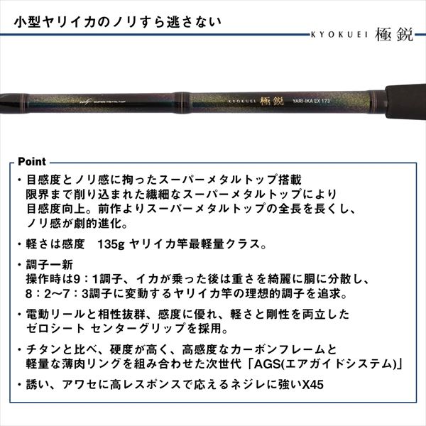 200m先の小型ヤリイカのノリすら逃さない ダイワ史上最高の目感度を実現。圧倒的な手返しの良さと、意のままの操作性を実現した鋭敏ショートモデル。■目感度とノリ感に拘ったSMT搭載。限界まで削り込まれた繊細なSMTにより目感度向上。これまでよりSMT全長を長くし、ノリ感が劇的進化。■軽さは感度 標準自重130g。ヤリイカ竿最軽量クラス。■理想の調子を追求。操作時は9:1調子、イカが乗った後は重さを綺麗に胴に分散し、8:2〜7:3調子に変動するヤリイカ竿の理想的調子を追求。■電動リールと相性が良く、感度に優れ、軽さと剛性を両立したゼロシート センターグリップを採用 ■チタンと比べ、硬度が高く、高感度なカーボンフレームと軽量な薄肉リングを組み合わせた次世代「AGS」■テスター陣のノウハウを数値化し、具現化するESS設計。■誘い、アワセに高レスポンスで応えるネジレに強いX45