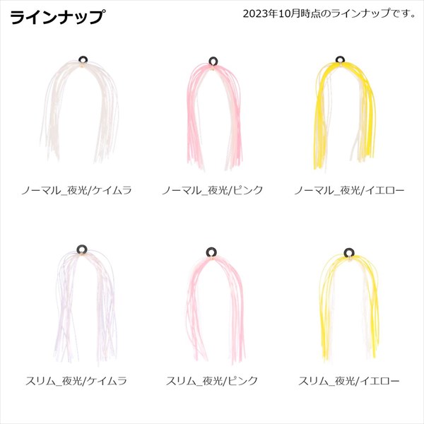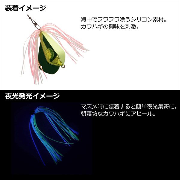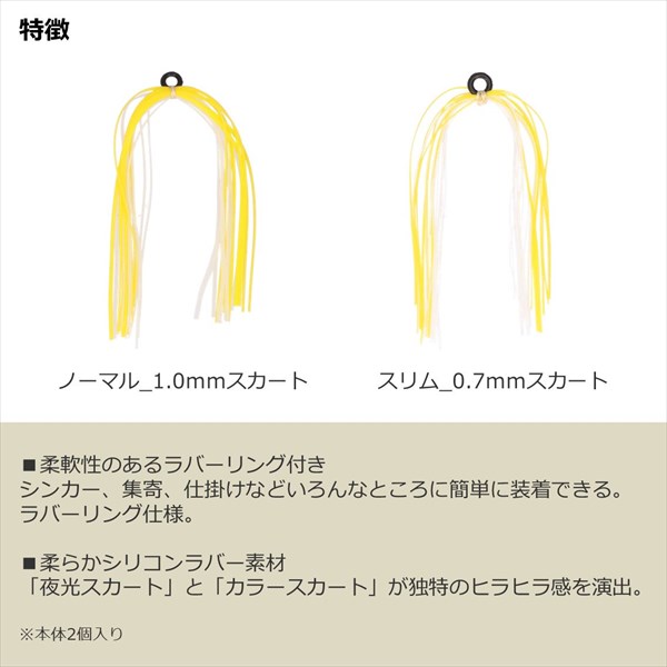 絶妙ボリュームでカワハギに強力アピール!!柔軟性のあるラバーリング!ラバーリング付きでシンカー、集寄、仕掛けなどいろんなところに簡単に装着できる。柔らかシリコンラバー素材!仕様で「夜光スカート」と「カラースカート」が独特のヒラヒラ感を演出。