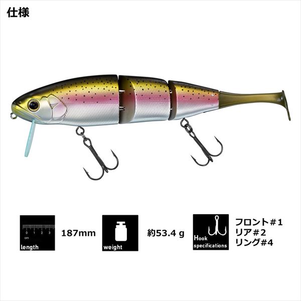 全長:187mm 自重:約53.4g タイプ:フローティング フック仕様:フロント♯1 リア♯2 リング仕様:♯4 テール素材:PVC(予備1本付属)