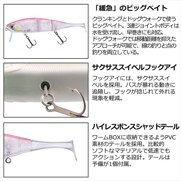 クランキングとドッグウォークで使う「緩急」のビッグベイト!3連ボディはクランクベイトよりも水押しが弱く、ビッグバイトでありながらナチュラルに攻めることができる。◆早巻きにも対応するリトリーブ性能と移動距離を抑えた首振りを得意とし、広範囲の釣りからピンスポットの釣りまでこれ1個でこなせる。◆テールはハイレスポンスに設計し、特に首振り時に時間差でブルブルっとアクションし喰わせの間を与える。◆フックアイにはサクサススイベルを搭載し、貴重なビッグバスを逃がさない仕様となっている。