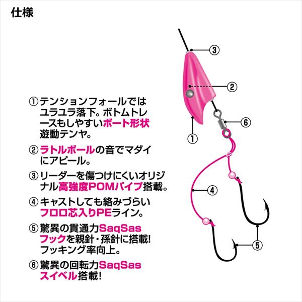 ユラユラフォールでマダイを誘う!!テンションフォールではユラユラ落下!ボトムトレースしやすいボート形状遊動テンヤがパワーアップして登場!■ラトルボール音でマダイにアピール!■リーダーを傷つけにくいオリジナル高強度POMパイプ搭載!■キャストしても絡みづらいフロロ芯入りPEライン!■驚異の貫通力サクサスフックを親針・孫針に搭載!フッキング率UP!■驚異の回転力サクサススイベル搭載!糸ヨレ激減!