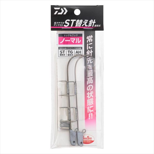 固定式タイプの替え針(ノーマル・ミドル)登場。船タチウオテンヤSS STに使用されている固定式の針の交換タイプ。また、STシリーズの他に、AH(半遊動式)、TG(固定式)にも装着可能なためカスタマイズの世界が広がる。針のベンド部分に平打ちを施すことで、刺さり・強度がUP。針サイズは2パターン・ノーマル(STと同様)・ミドル(AHミドル、TGと同様)
