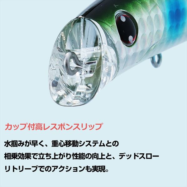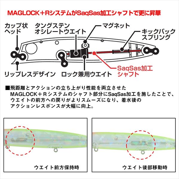 小沼正弥監修。デッドスローリトリーブ対応、高レスポンス設計。低活性・低水温期にただ巻きだけで食わす為のシャローレンジ攻略用リップレスミノー。デッドスロー対応、スローピッチフラッタリングロールアクション。幅狭スリムボディで、ヨタヨタと弱った魚の様なアクションを発生。スローピッチでおとなしいアクションによりスレたシーバス、エリアに対応。こだわりのバランス設定により、感度も高く、タダ巻きだけで流れの境目やヨレで自動的にフラッとバランスを崩し軌道変更するためそれが食わせの間となります。MAGLOCK+Rシステムのシャフト部分をSaqSas加工した「MAGLOCK Ver.S+R」の搭載により、飛距離のロスを最小限に抑えつつウエイトの戻りが大きく向上。カップ状のリップと相まって着水後のリトリーブで速やかにアクションが立ち上がる上、デッドスローリトリーブのレスポンスも秀逸。