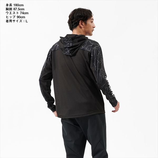 通気性に特化した真夏の定番シャツ。猛暑や湿気などが身体へのダメージを極力低減させるために、前身頃と袖部には、ストレッチ性・UVケア・吸水速乾性のある生地を採用。フード首部、後身頃、脇下は、風通しの良いメッシュで切り替えている。