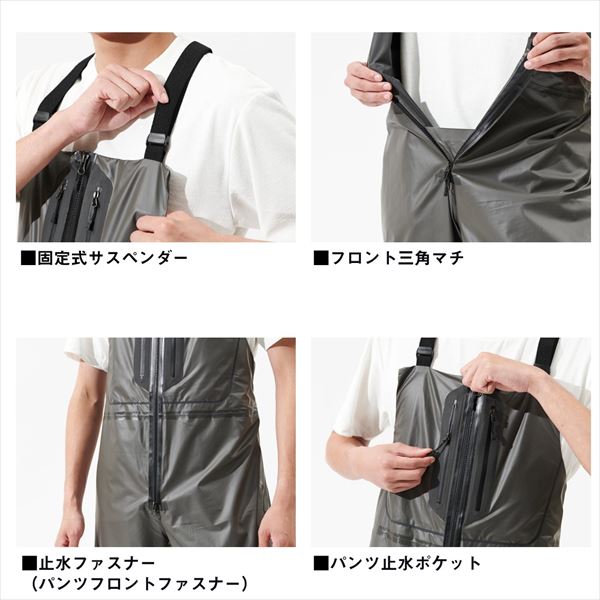 汚れの付きにくさと透湿性を兼ね備えたレインビブ。汚れや海水が付いても、水でさっと洗えば落ちやすい素材を開発。表側に防水層をもってくることで、水が生地に染み込まず、ドライで乾きやすい。PU,PVC等の船レインと比べ、透湿性があるため、衣服内が蒸れにくく、気温の高い時期でも快適に着用可能。船レインと比べ、シルエットをスリムにすることができ、動きやすい。擦れやすい膝部、尻部は二重に補強。フロントには上下から開閉できる止水ファスナーを採用。単体でも使用しやすいよう、胸ポケットを搭載。※透湿防水層を最外面に配した特殊構造のため、過度の擦れに弱い性質があります。製品によっては色ムラが出る可能性があります。※特殊な防水加工を施しているため、撥水スプレーは使用しないでください。
