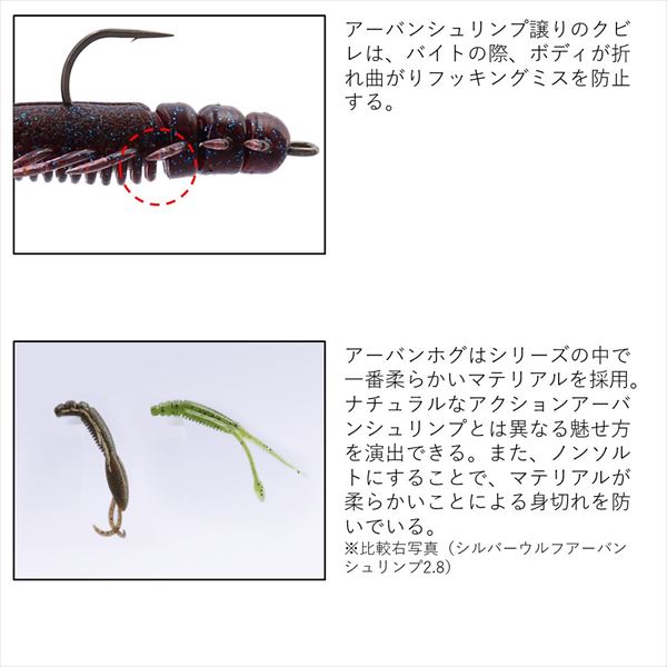 緩急自在のナチュラルな水押しと存在感でアピールするオールラウンダー!全国でブームを引き起こしている、フリリグチニングゲームの第一人者、森浩平テスター(通称:もりぞー)監修ワームの第3弾。低活性字のスローな展開を得意とするアーバンシュリンプに対し、アーバンホグは、よりボリュームが欲しい春の時期やアピールは最小限にテンポよく釣りを行う展開に有効。ナチュラルな水押しと存在感でアピールする。爪の形もチニング専用設計。爪をウチワ形にせず、後端を絞ったデザインを採用。ボリュームは確保しつつ空位抵抗を減らすことで飛距離と操作性が向上し、ホグ独特の飛距離不足や操作感のダルさを解消している。
