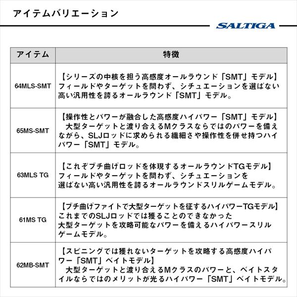現代SLJシーンを牽引する性能とテクノロジーが詰まったスーパーフラッグシップSLJロッド。■63MLS TG(これぞブチ曲げロッドを体現するオールラウンドTGモデル)・・・フィールドやターゲットを問わず、シチュエーションを選ばない高い汎用性を誇るオールラウンドスリルゲームモデル。ブランクは超細身・高弾性・高強度を誇るメガトップR(T1100Gソリッド)を芯材としたフルソリッド構造で、シチュエーションに応じて最適な曲がりと反発力を提供してくれる。その結果、スリルゲームが得意とするブチ曲げファイトはそのままに、フルソリッドならではのダルさを排除することに成功。快適なジャークやロングキャストが可能となった。曲げれば曲げるほどに真価を発揮するブランクは、ライトタックルで様々なターゲットを攻略するというSLJの醍醐味を体感できるアイテムに仕上がっている。