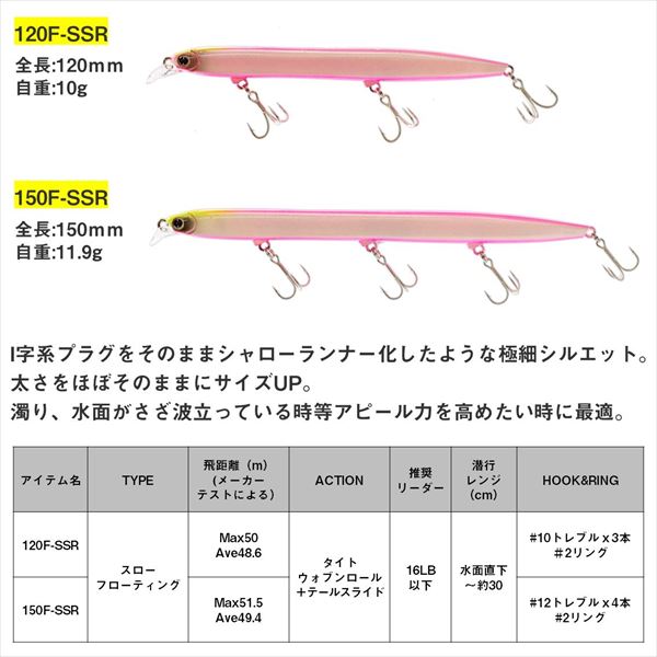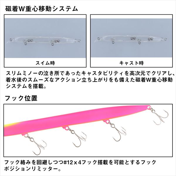 小沼正弥監修。密かに爆れ。バチ、サヨリ、シラス、激スレパターン対応、極細シルエットの水面直下攻略型ぶっ飛びシャローランナー。細身・小型ベイトに偏食している時、激スレ時に最適。バチ、サヨリ、シラスはもとより、イワシや稚アユ等の小型ベイトパターンにベストマッチな極スリムシルエット。高レスポンス&スレに強いタイトウォブンロール+テールスライドアクションで、低速〜高速まで全てのリトリーブに対応。ロッドポジションとリトリーブ速度の組み合わせで水面直下〜約30cmが有効レンジ。風雨等でI字系スリムプラグが太刀打ちできない状況でも、一枚下のレンジでしっかりアピールできる。極細ボディながら磁着重心移動を前後にダブルで搭載し、「スリムミノーは飛ばない」イメージをくつがえす快適なキャスタビリティと立ち上がり性能を両立。