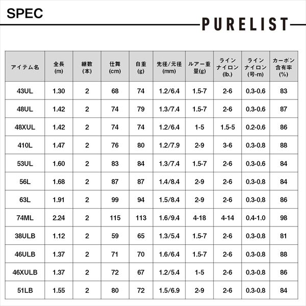 あらゆるシチュエーションに対応する、専用調子のネイティブトラウトロッド。新たな外観、新たな使用感を持ち併せた、ネイティブトラウトロッドのスタンダードモデル。ネイティブトラウトロッドのスタンダード「PURELIST」。今回追加される、「48XUL」「46XULB」は、スピニング・ベイト両タイプとも、40mm前後・3g前後のルアーもキャスト・コントロールしやすい2本をラインアップ。誰でも曲げやすく、正確なキャスト(アキュラシーキャスト)が可能になり、渓魚との距離を縮めてくれるアイテム。