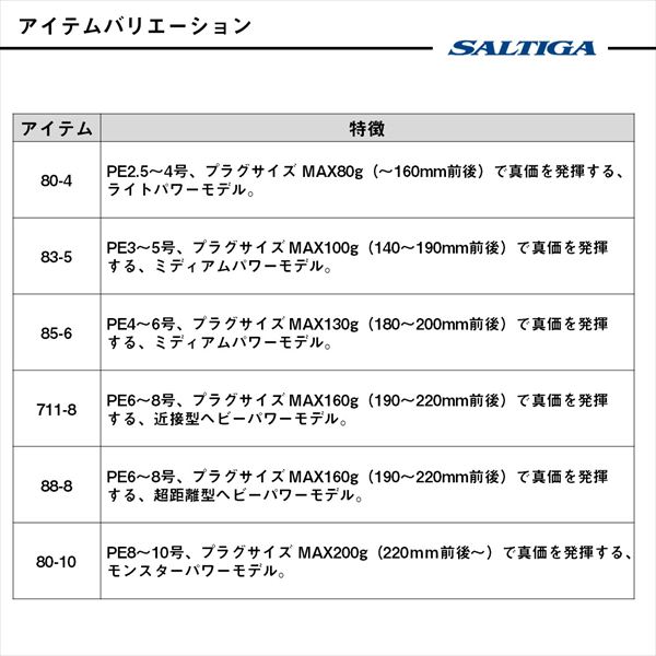パワーで捻じ伏せろ〜。圧倒的な飛距離とリフト力を誇る、短期決戦型ハイパワーキャスティングロッド。■80-10・・・PE8〜10号、プラグサイズ MAX200g(220mm前後〜)で真価を発揮する、モンスターパワーモデル。ビッグプラグを容易に振り抜くことができるパワーブランクは、ガチンコファイト時に真価を発揮。まさにBREAK YOUR RECORDを実現させる為のシリーズ最強モデル。