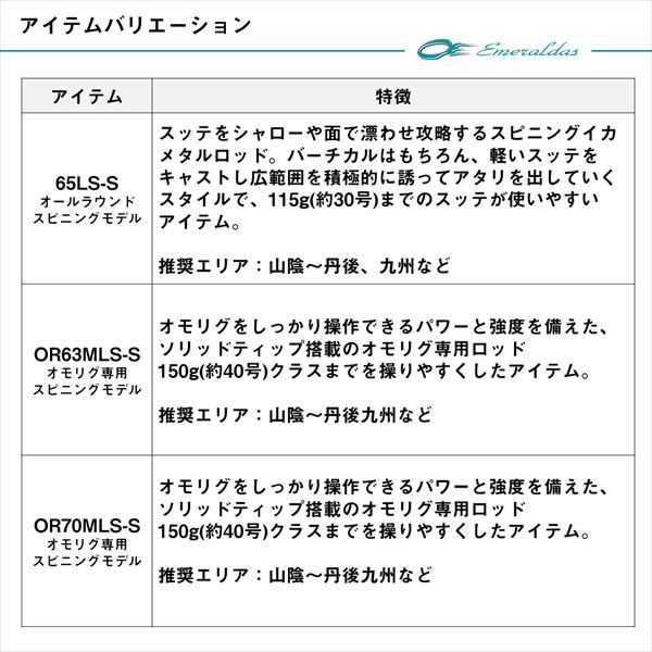 フィールドで磨き上げた本格調子が、イカメタルをもっと楽しくする。■OR70MLS-S・・・オモリグをしっかり操作できるパワーと強度を備えた、ソリッドティップ搭載のオモリグ専用ロッド。150g(約40号)クラスまでを操りやすくしたアイテム。重量のあるリグをしっかりキャストでき、フッキングに適したバットパワーとイカのアタリを察知することができる繊細なティップを搭載。7.0ftのやや長めのレングスは、船べりが高い乗合船でもアタリがとりやすく、ロングリーダーにも対応などのメリットがある。さらに通常のイカメタルロッドよりリアグリップを長く設定し、ヘビーウエイトのリグを使用しても脇でしっかりとロッドを支えて操作することが可能。推奨エリア…山陰〜丹後など