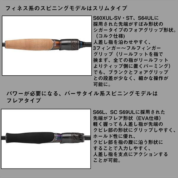 PEラインを駆使することでフロロでは不可能だった幅広いバーサタイル性を兼ね備えたショアコンペティションのフィネスロングスピン、それがSCキングボルトフィネススペック69。操作性に優れた初代STEEZ06キングボルトのテーパーバランスを踏襲し、Lパワーでは扱いにくい下限ルアーの操作性を向上させるためにULパワー化。伸びの少ないPEラインを使う事でフロロでは扱えなかった領域のリグ・ルアーの使用が可能になり、「一本で幅広く」がさらに昇華。リーダーの長さを調整することで連続トゥイッチなどのダイレクトな操作も可能。「AGS」と「CWS」を採用し、DAIWAカーボン成形技術とSVFの「トレカM46X」が融合を採用することで、バットパワーを落とすことなく細径化と高反発化を実現し、遠投性能、操作性、感度を飛躍的に向上させた。