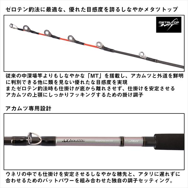 柔軟メタルトップが仕掛けを安定させる、最新アカムツ釣法に対応した専用竿。しなやかなメタルトップがこれまでにない目感度を実現。穂先部には、従来の中深場竿よりもしなやかな「メタルトップ」を搭載。うねりの中でもしっかりと仕掛けを安定させるゼロテンキープ力と、アカムツと外道を鮮明に判別できる目感度を実現。アタリに遅れずに合わせるために、穂持ちとバット部にパワーを持たせ、独自の調子セッティングを施したアカムツ専用竿。■ゼロテン釣法に最適で、目感度に優れたしなやかなMT ■「AGS」と「MT」の組み合わせが高感度を実現 ■V-JOINTの採用。高負荷時もパワーロスを軽減しスムーズで綺麗な曲がりを実現。■理想のシートはその存在を感じさせないZERO_SEAT。電動リールと合わせたグリップ性能を追求したセンターグリップ採用。■X45により、粘りとパワーの向上。■全アイテムフォアグリップ装備
